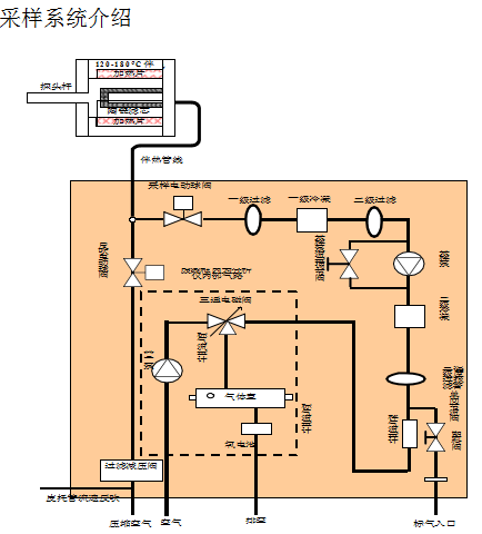 道,以滿足系統(tǒng)反吹的需要。采用一體化采樣伴熱線包。加熱采樣線為電加熱方式。加熱采樣線的加熱套管中有溫度傳感器,由溫度控制器控制并提供伴熱溫度報(bào)警信號輸出。在分析儀界面上輸入濕度后,可將被測氣體濃度轉(zhuǎn)換為干煙氣濃度。分析儀定時(shí)會(huì)進(jìn)入校準(zhǔn)狀態(tài)進(jìn)行自動(dòng)調(diào)零,此時(shí)系統(tǒng)切換到反吹氣路,調(diào)零閥打開,在分析儀內(nèi)部采樣泵的作用下,環(huán)境空氣經(jīng)過直接進(jìn)入氣體室,對氣體室中殘留的被測氣體進(jìn)行吹掃,從而實(shí)現(xiàn)調(diào)零,同時(shí)實(shí)現(xiàn)氧的量程校準(zhǔn);調(diào)零同時(shí),系統(tǒng)控制反吹球閥開或關(guān),實(shí)現(xiàn)對伴熱管、探頭過濾器的反吹。