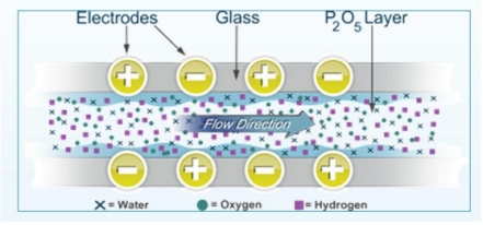 基本原理:傳感器采用五氧化二磷電解法原理,此傳感器由一個玻璃材質(zhì)的圓柱和兩根并行的電極(通常由鉑或銠金屬絲制成)組成,并在兩根電極之間涂有很薄的一層磷酸膜層。在兩電極間施加一直流電壓,氣體中的水分被作為吸濕劑的五氧化二磷膜層連續(xù)吸收,生成磷酸,并被電解為氫和氧,同時五氧化二磷得以再生。通過連續(xù)的電解過程,在樣氣的水分含量與電解后的水分之間建立平衡,電解電流與樣氣中水分含量成比例。